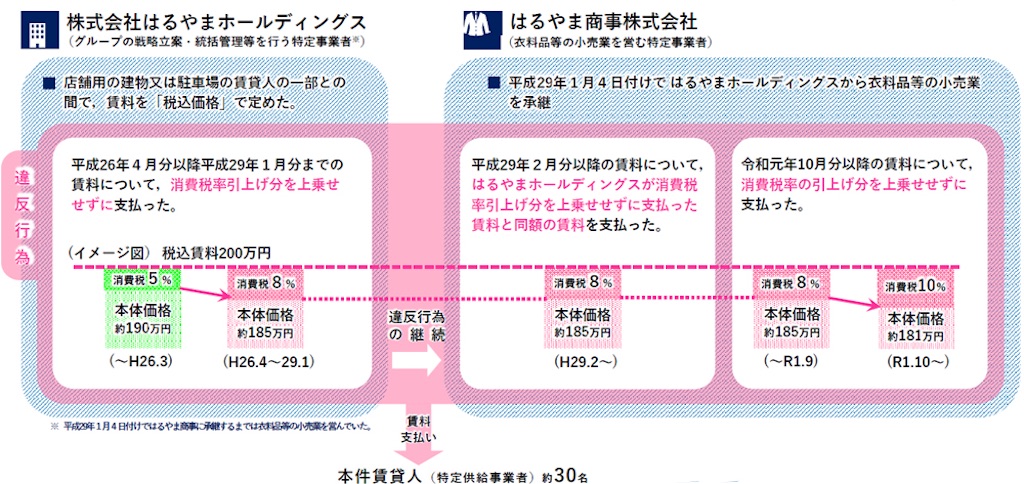 その具体的な内容はどんなものかというと、上記2社は消費税が8%に引き上げられた2014年4月以降、店舗用の建物や駐車場の賃貸借契約を結ぶ36業者に対して、増税分にて上乗せとなる賃料を払っていなかったというもの。